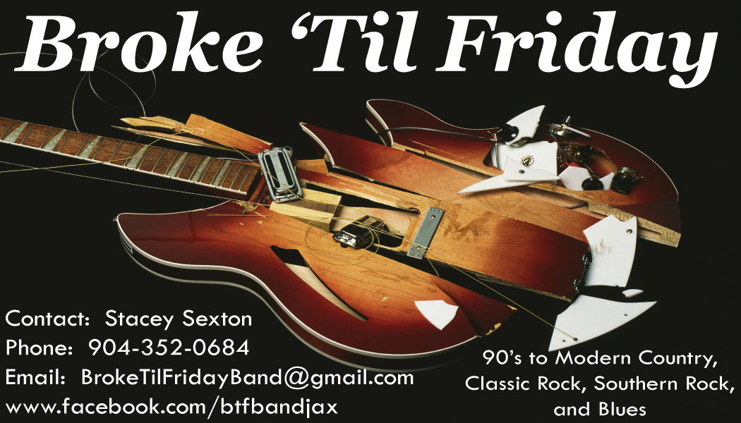 Broke 'Til Friday is a dynamic band in the Jacksonville area. We perform Country Music hits from the 90's to today, along with some classics. We also add in fan favorite Classic Rock, and some Blues. We like to keep the crowd excited, engaged, and on the dance floor.